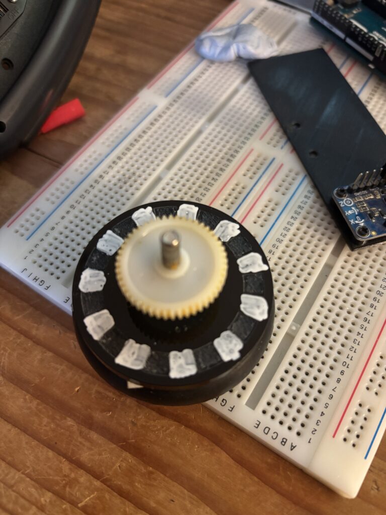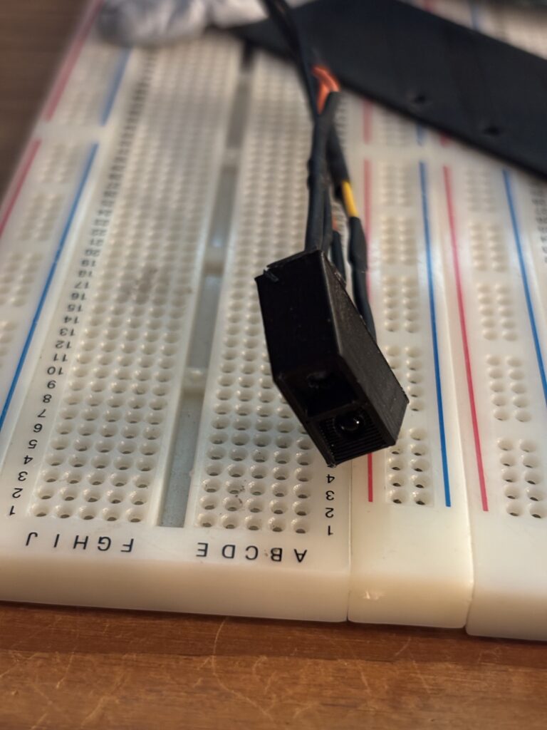 The encoders themselves were 3D printed form PLA and each contains an IR LED and photo transistor set at 45 degrees: