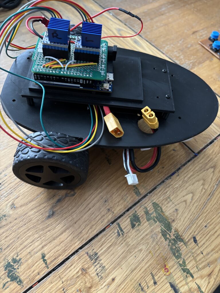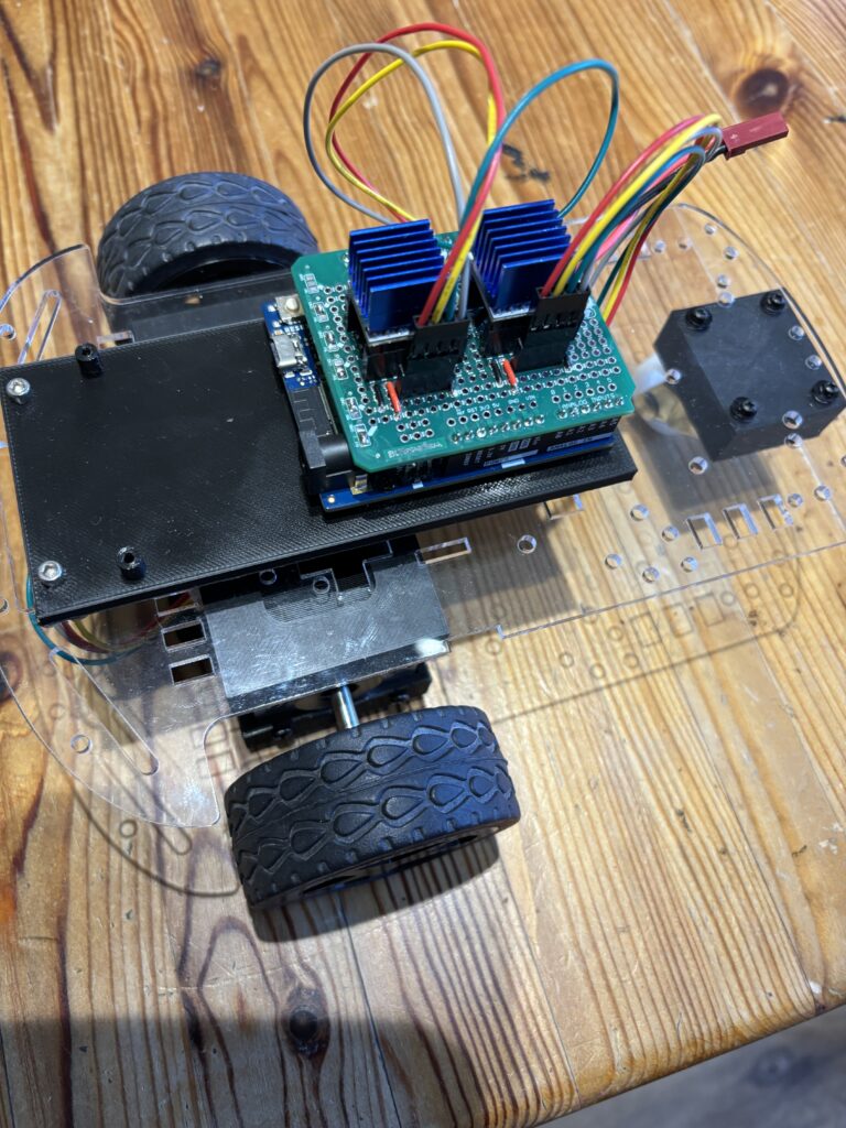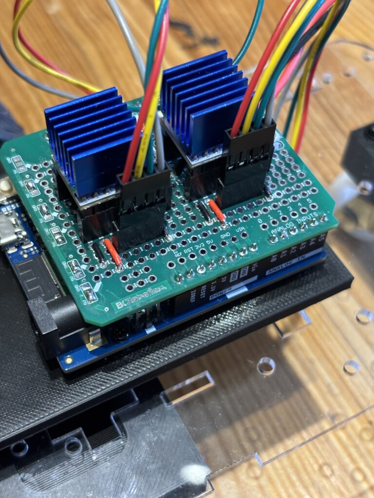 The whole buggy is controlled through one of the new generation Arduino Uno R4 wifi microcontrollers, which has built-in bluetooth low energy. The stepper controller were mounted on a custom shield for the arduino (see above) that was constructed from a simple prototyping board. This particular board is made by BC Robotics, and an excellent prototyping shield for the uno. Unfortunately, they are a bit difficult to get hold of at the moment, so I am developing one of my own,