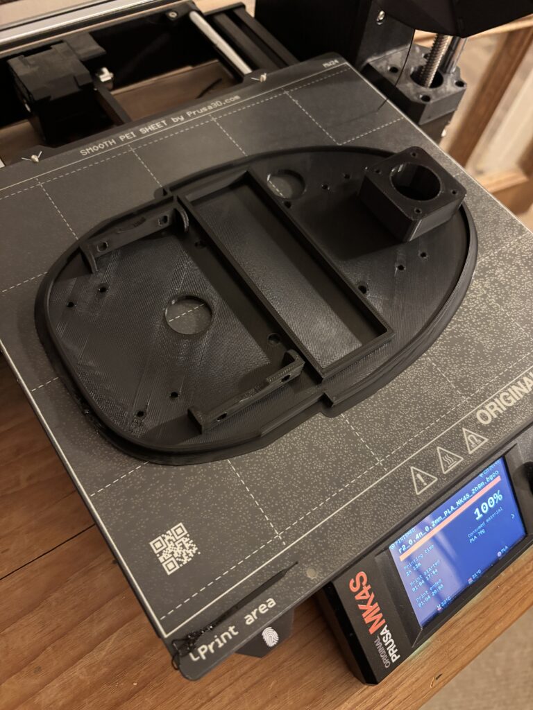 The underside of the buggy (where the stepper motors are attached) is shown above just after it had finished printing. Some additional support brackets were also needed to house the on/off switch and support the Arduino Uno: